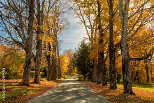 Obraz premium asphalt alley among mighty trees on a sunny autumn day.
