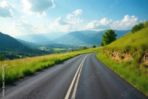 Naklejka premium Asphalt cycling road winding through scenic countryside , bend, vibrant