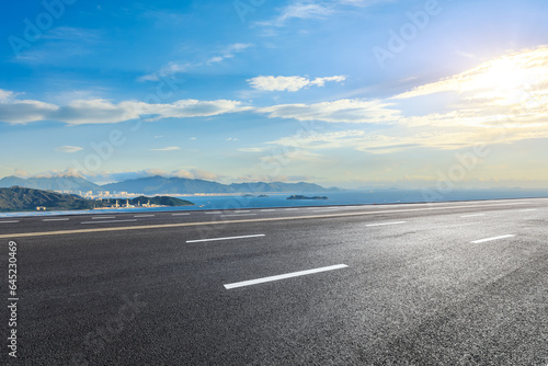 © ABCDstock, Fototapeta premium Asphalt highway and sea with island natural landscape at sunset