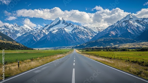 Fototapeta premium Asphalt highway leading to towering snow-capped mountains and lush valleys,...