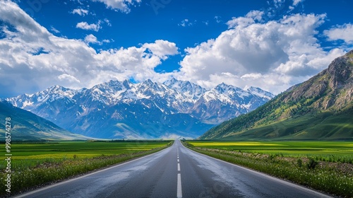 Fototapeta premium Asphalt highway leading to towering snow-capped mountains and lush valleys,...