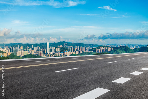 © ABCDstock, Fototapeta premium Asphalt highway road and city skyline with green mountain under blue sky