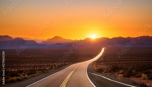 Fototapeta premium asphalt highway vanishing into a vibrant sunset over a vast mountainous desert landscape