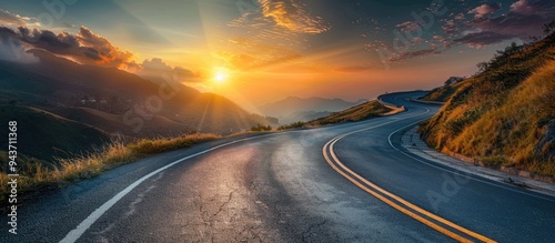 © vxnaghiyev, Naklejka premium Asphalt highway with an empty curved road featuring clouds and the sky at sunset. with copy space image. Place for adding text or design
