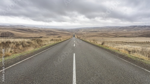 © Xavier, Fototapeta premium asphalt. Panoramic view of an empty road under cloudy skies, capturing a serene and open landscape. travel magazines, destination branding, designed for outdoor magazines and nature guides.
