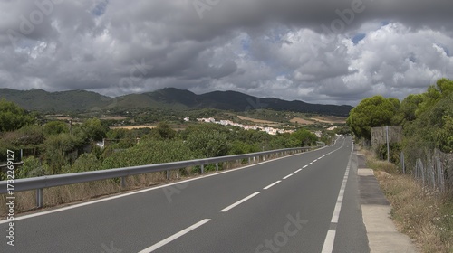 Fototapeta premium asphalt. Panoramic view of an empty road under cloudy skies, capturing a...