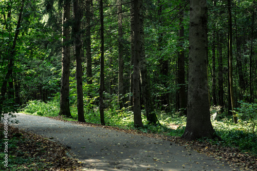 © Анна Демидова, Fototapeta premium Asphalt path in a dense green forest with sunbeams. Walks in the open air.