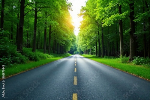 © Vibrant Visions Pixe, Fototapeta premium Asphalt Pathway Through a Lush Green Canopy of Trees on a Sunny Day