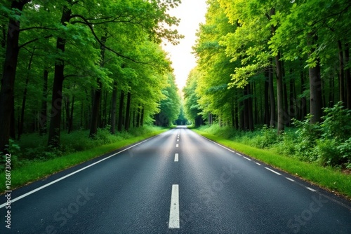 Fototapeta premium Asphalt Pathway Through Lush Green Forest Canopy, Sunlight Streaming Through...