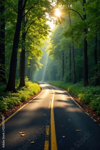 Fototapeta premium Asphalt ribbon curves through silent woods, sun dappled leaves , turn, road trip