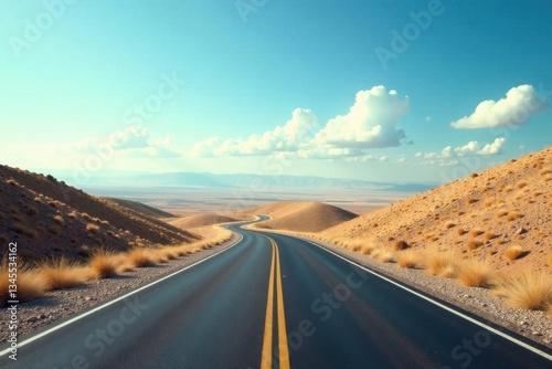 Naklejka premium Asphalt ribbon curving through a sun-drenched desert landscape under a vast, bright blue sky, promising adventure and open road ahead