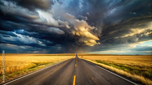 Fototapeta premium Asphalt ribbon stretching towards a dramatic sky, a vast golden field...