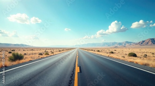 Naklejka premium Asphalt ribbon stretching towards distant mountains under a bright summer sky, promising adventure and freedom on an open road journey