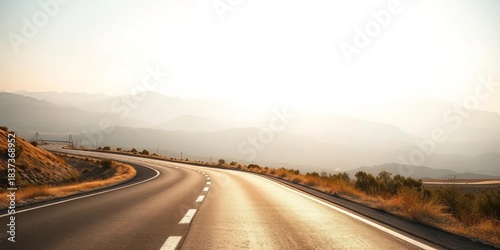 Naklejka premium Asphalt ribbon vanishing into hazy distance, sun-drenched landscape, clouds,...