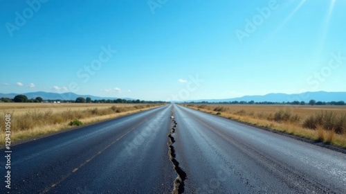 Naklejka premium Asphalt Road Ahead Showing a Crack in the Pavement Extending to the Horizon Under a Clear Blue Sky