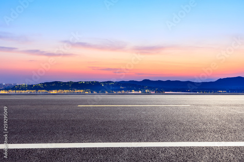 Fototapeta premium Asphalt road and beautiful mountain nature landscape at sunset