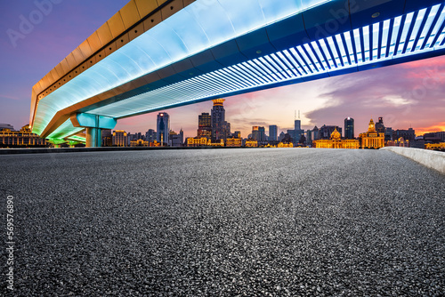 © ABCDstock, Naklejka premium Asphalt road and bridge with city skyline at sunset in Shanghai, China.
