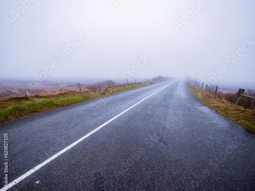 Naklejka premium Asphalt road and fields in country side in a fog. Dangerous driving conditions with low visibility and wet road surface. Mist over wild nature.