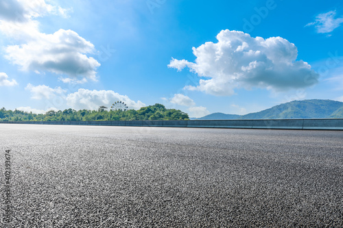 © ABCDstock, Fototapeta premium Asphalt road and green mountain under blue sky.Road and mountain background.