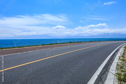 Fototapeta premium Asphalt road and lake with sky clouds natural scenery in Xinjiang, China.