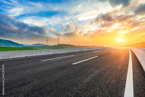 © ABCDstock, Fototapeta premium Asphalt road and mountain at sunset.Road and mountain background.