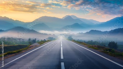 Naklejka premium asphalt road and mountains with foggy nature landscape at sunset