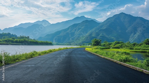 © IntelliArt, Naklejka premium Asphalt Road And River With Mountain Scenery In Hangzhou, A Picturesque Landscape