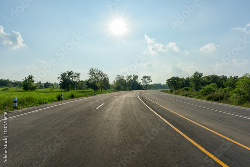 © yotrakbutda, Fototapeta premium asphalt road and sun on blue sky