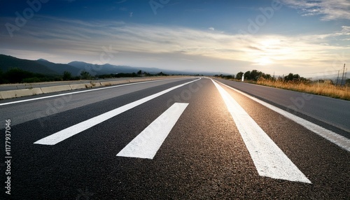 Naklejka premium Asphalt road at sunset with mountains in the background.