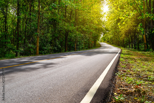 Fototapeta premium Asphalt road curve pass through the green forest tree with sunlight