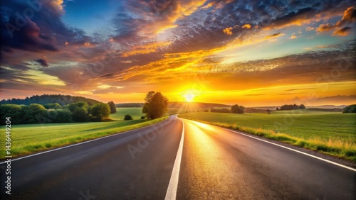 © parichart, Naklejka premium Asphalt road curving gently through vibrant green fields towards a breathtaking sunset, bathed in golden light and dramatic clouds