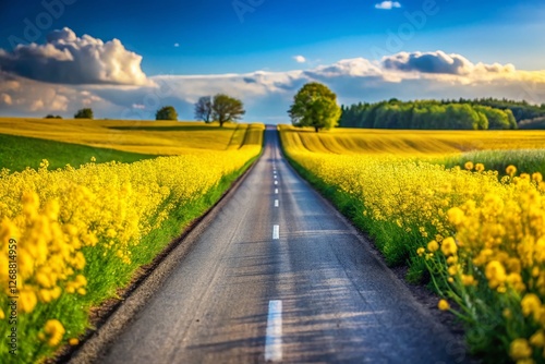 © Danicha, Obraz premium Asphalt Road Cutting Through Vibrant Rapeseed Fields - Spring Landscape Photography