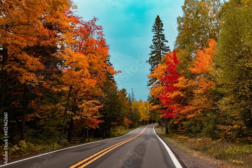 Obraz premium Asphalt road going through a mesmerizing forest in fall colors, autumn...