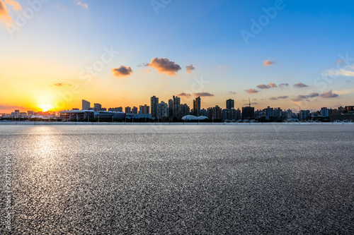 © ABCDstock, Fototapeta premium Asphalt road ground and city skyline at sunset in Shanghai,China.