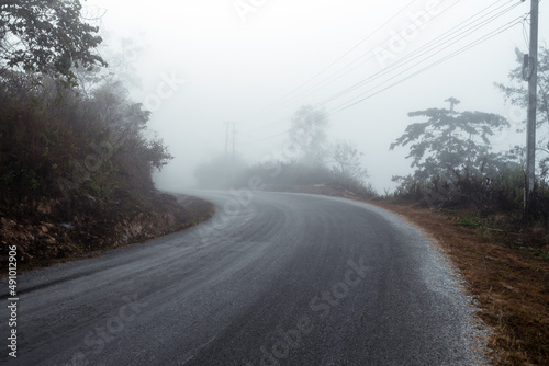 Fototapeta premium Asphalt road in a fog in the mountains