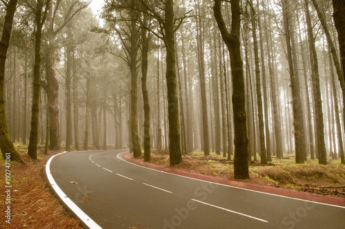© Kotangens, Fototapeta premium Asphalt road in foggy forest on Tenerife