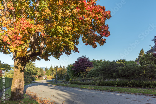 © Viktor Birkus, Naklejka premium asphalt road in the autumn street with trees and fallen leaves, private residential house