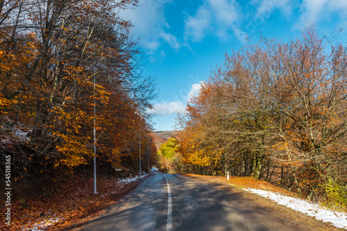 © Vastram, Fototapeta premium Asphalt road in yellow autumn forest