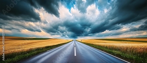 © naim74, Naklejka premium Asphalt Road Leading Through Fields Under a Dramatic Sky, Generative Ai