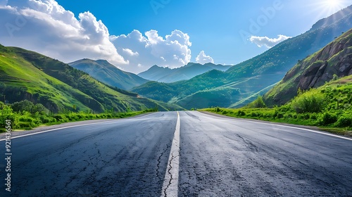 Naklejka premium Asphalt Road Leading Through Lush Mountain Landscape
