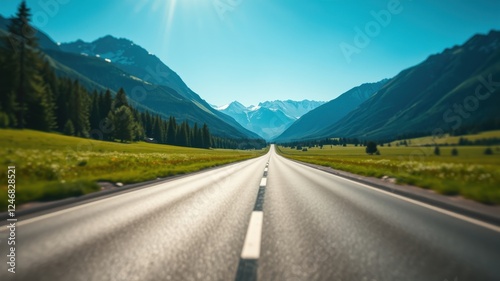 © sasiprapa, Fototapeta premium Asphalt road leading to majestic mountain range on a sunny day