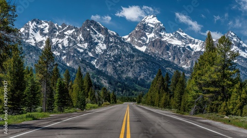 Fototapeta premium Asphalt road leads toward majestic, snow-capped mountain range under a bright...