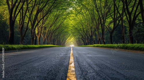 © Gajah, Fototapeta premium Asphalt road lined by lush green trees creating a tunnel effect. Sunlight streams through the canopy.