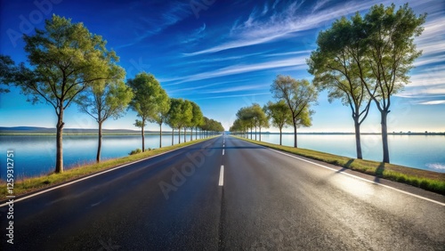 © Pluto, Naklejka premium Asphalt road lined with trees beside a tranquil lake under a vibrant sky, a scenic summer day drive