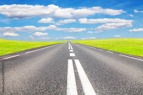 © charmphoto, Naklejka premium Asphalt road, meadow and sky. The road is intended for advertising