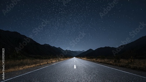 © Alicia, Fototapeta premium Asphalt road stretches into the distance under a starry night sky and mountains.