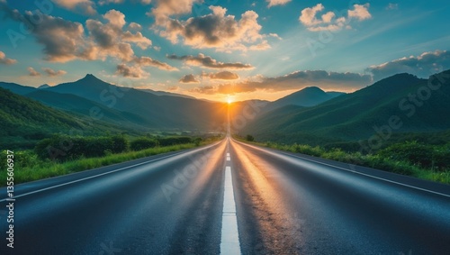 Naklejka premium Asphalt road stretching through green mountains under a sky filled with clouds at sunset.