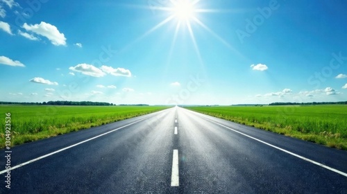 Fototapeta premium Asphalt road stretching to a bright horizon under a vivid summer sky, flanked by verdant fields