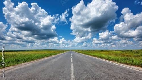 © Aether Pixels, Fototapeta premium Asphalt Road Stretching to Horizon Under Blue Sky with Clouds Eye Level Perspective in Rural Landscape
