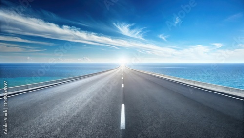 Fototapeta premium Asphalt road stretching towards a bright horizon over tranquil ocean waters...